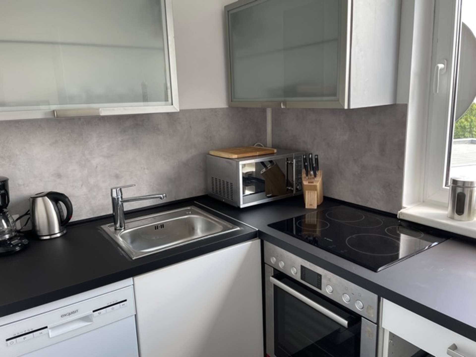 Die Einbauküche ist mit folgenden Elektrogeräten ausgestattet: Elektroherd, Backofen, Spülmaschine, Mikrowelle, Kaffeemaschine, Wasserkocher u.a. Auch notwendiges Geschirr, Gläser, Töpfer, Pfannen, Bettwäsche, Bügeleisen, Bügelbrett etc. stehen dem Mieter zur Verfügung.
